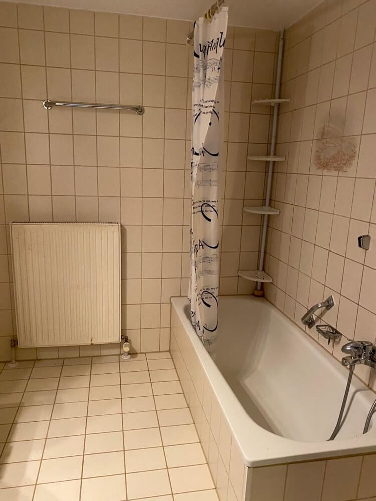 - Badezimmer mit Badewanne und Waschmaschinenanschluss